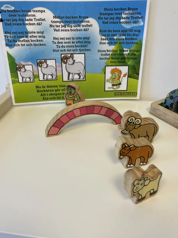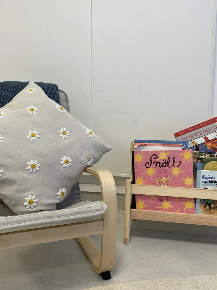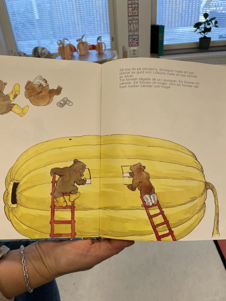 Läsning är både underhållning och guldgruvor för språkförståelsen. Innan läsningen diskuterar gruppen bokens framsida och lär sig berättelsens svårare ord med hjälp av bilder. Ovanliga ord de möter under läsningen ger tillfälle att förse barnen med synonymer. De kan även göra konkretiserande dramatiseringar, som när de läser Sagan med vanten och handlingen utspelar sig med en riktig vante i rummet. Snart blir högläsningen extra spännande, när en pensionerad pedagog som bor på äldreboendet ovanför ska läsa för barnen en gång i veckan. Högläsningen tydliggör språkmelodi, något de övar mycket på även i muntliga förmågorna. “Barnen läser sig mycket genom att lyssna och härma”, säger Isabel. Därför använder de element som är lätta för barnen att minnas och upprepa, som sånger, rim och ramsor. Då inkluderas även fonem och artikulation.