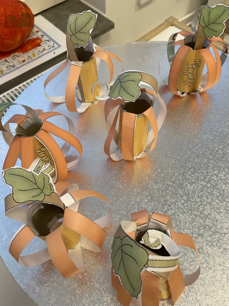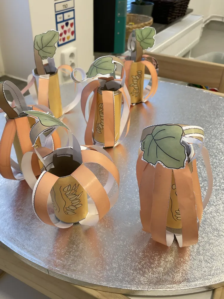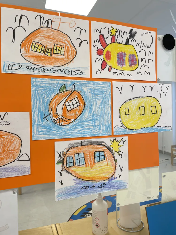 Med siktet på årliga Vårsalongens litteraturtema är Den underbara pumpan temat i språkarbetet. Projektet syns i rummen på avdelningen Skeppet. På väggen hänger barnens vattenfärgspumpor. Papier maché-pumpor torkar i fönstret, intill bordet där barnens högsmala kartongkrukor väntar på pumpafrön. Fröna har barnen förberett under en naturvetenskaps- och språkkombinerad aktivtet. Innan pumpafrönens pumpa blev isärplockad och undersökt användes den till och med för att öva lägesord - ett av många tillfällen det övats på att att beskriva saker i förhållande till varandra med hjälp av prepositioner, läges-, motsats- och jämförelseord.