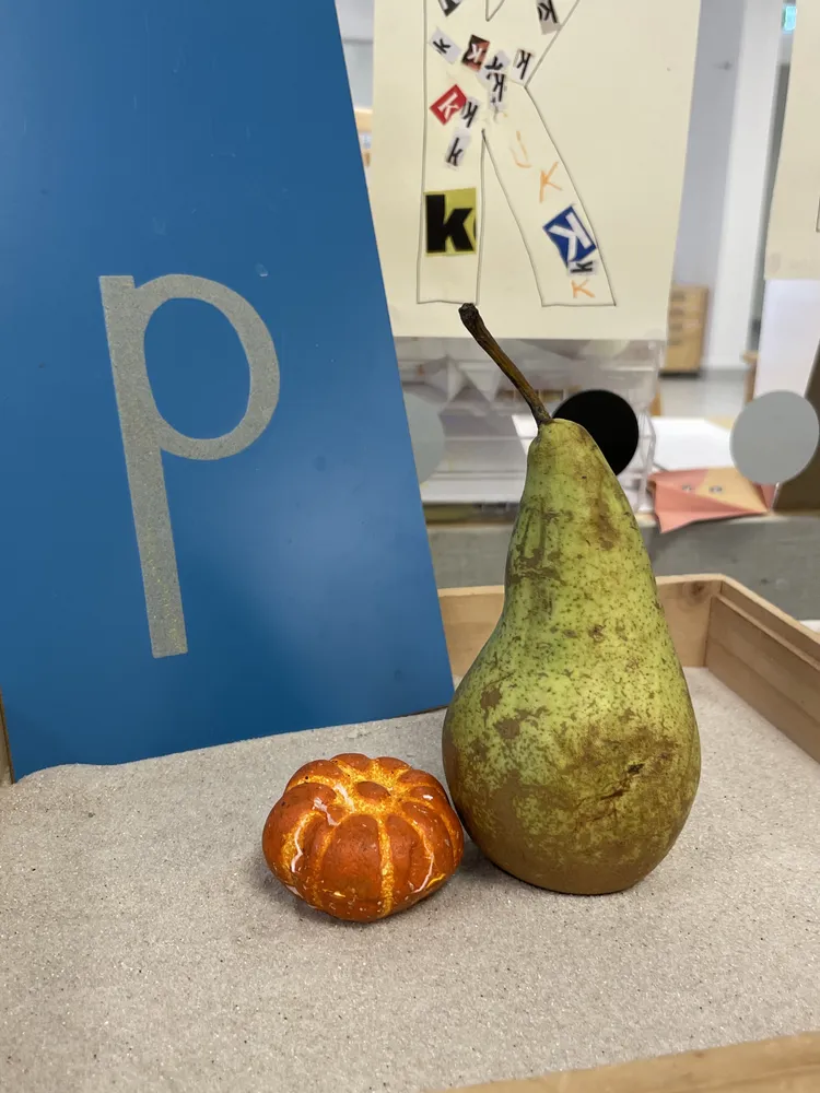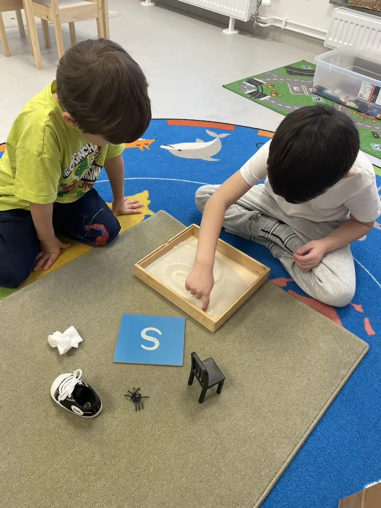 Isabel använder montessorimaterial för att involvera barnens sinnen. Barnen får dra fingret över en mjuk bokstavsformad sandpappersyta, skriva i små sandlådor och skapa ord med ‘det rörliga alfabetet’. Kreativitet och lek används i bokstavsinlärningen, med pyssel och färgläggning. I montessoripedagogiken är även miljön central. Därför har varje rum läshörnor i barnhöjd och alfabetet på väggen. På montessorihyllan står temabokstaven P bredvid en pumpa och ett päron. Till och med barnens pysselunderlägg är alfabet. Inlärningen av bokstäverna bygger successivt vidare till att koppla bokstäver till ord, genom att ljuda, säga första bokstaven, skriva sitt namn och ord.